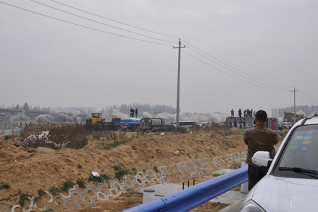 由于機(jī)場(chǎng)高速新收費(fèi)站的通車,此匝道橋的功能被新通車的機(jī)場(chǎng)高速收費(fèi)站匝道橋所代替,原設(shè)計(jì)的老匝道橋所占位置不利于安全和互通立交橋的美觀和綠化,經(jīng)請(qǐng)示上級(jí)決定對(duì)其實(shí)施爆破拆除,整個(gè)爆破作業(yè)安全順利,一次成功。(集團(tuán)綜合部、二公司、機(jī)場(chǎng)改擴(kuò)建BT項(xiàng)目部)