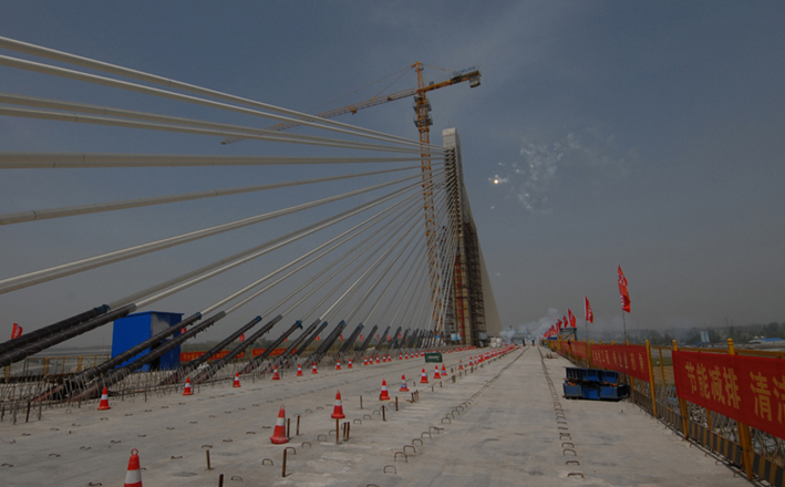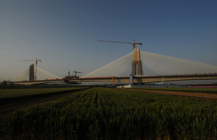 商登高速南水北調(diào)斜拉橋位于鄭州市航空港綜合實(shí)驗(yàn)區(qū)西南隅,為雙塔單索面部分預(yù)應(yīng)力混凝土矮塔斜拉橋。主橋中跨265米凌空飛渡南水北調(diào)中線總干渠,是目前同類型橋梁的“亞洲第一跨”。